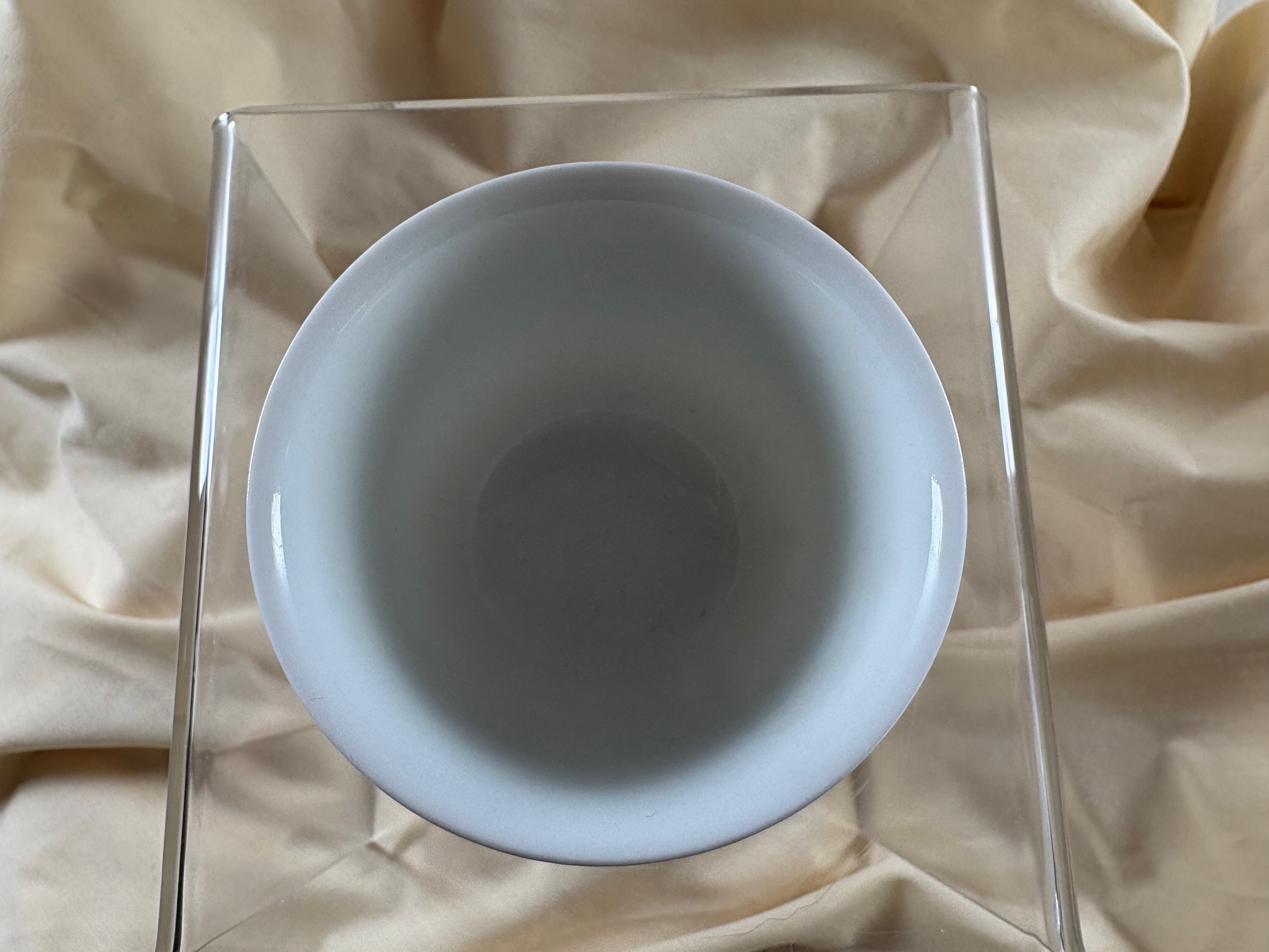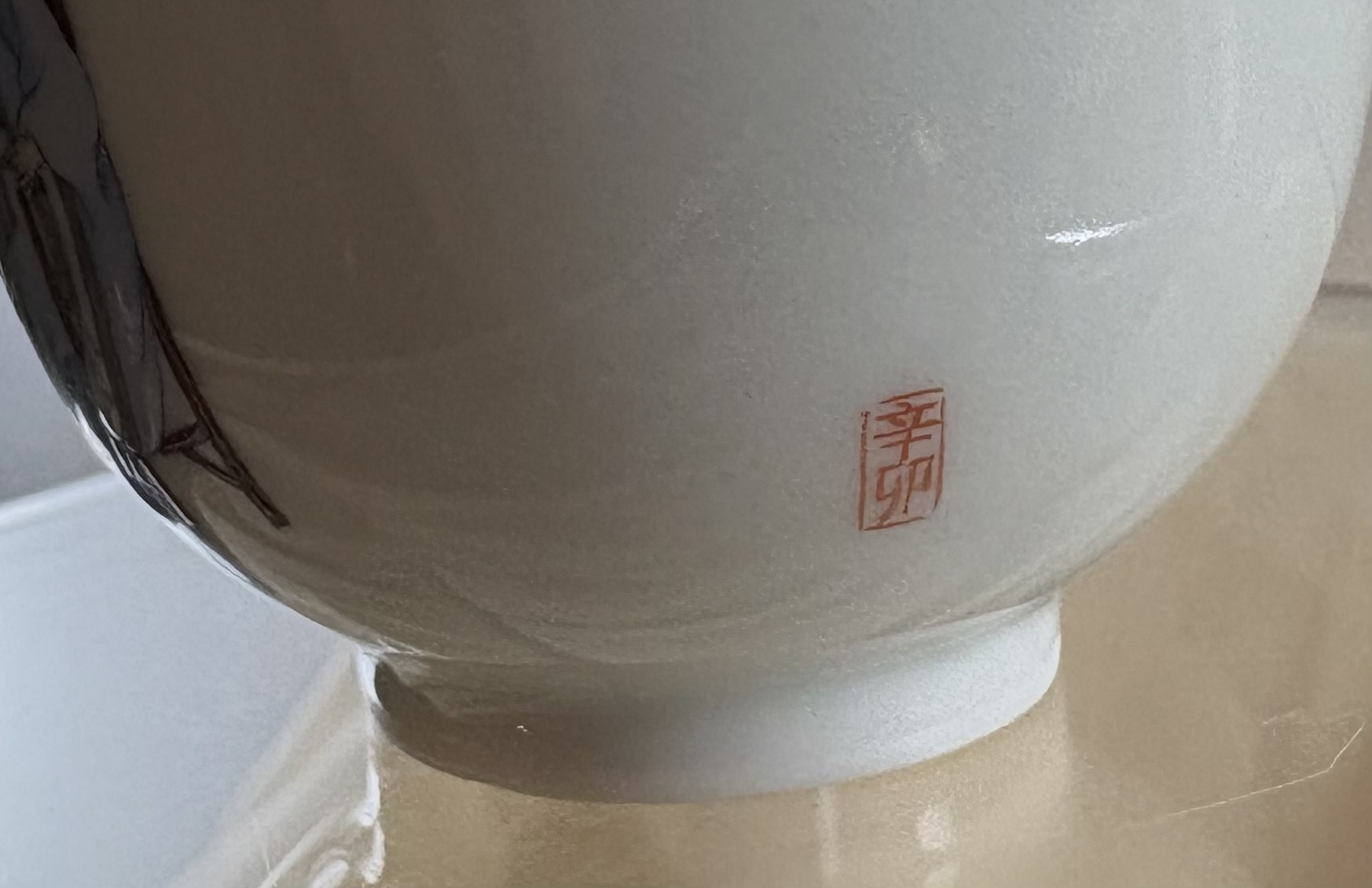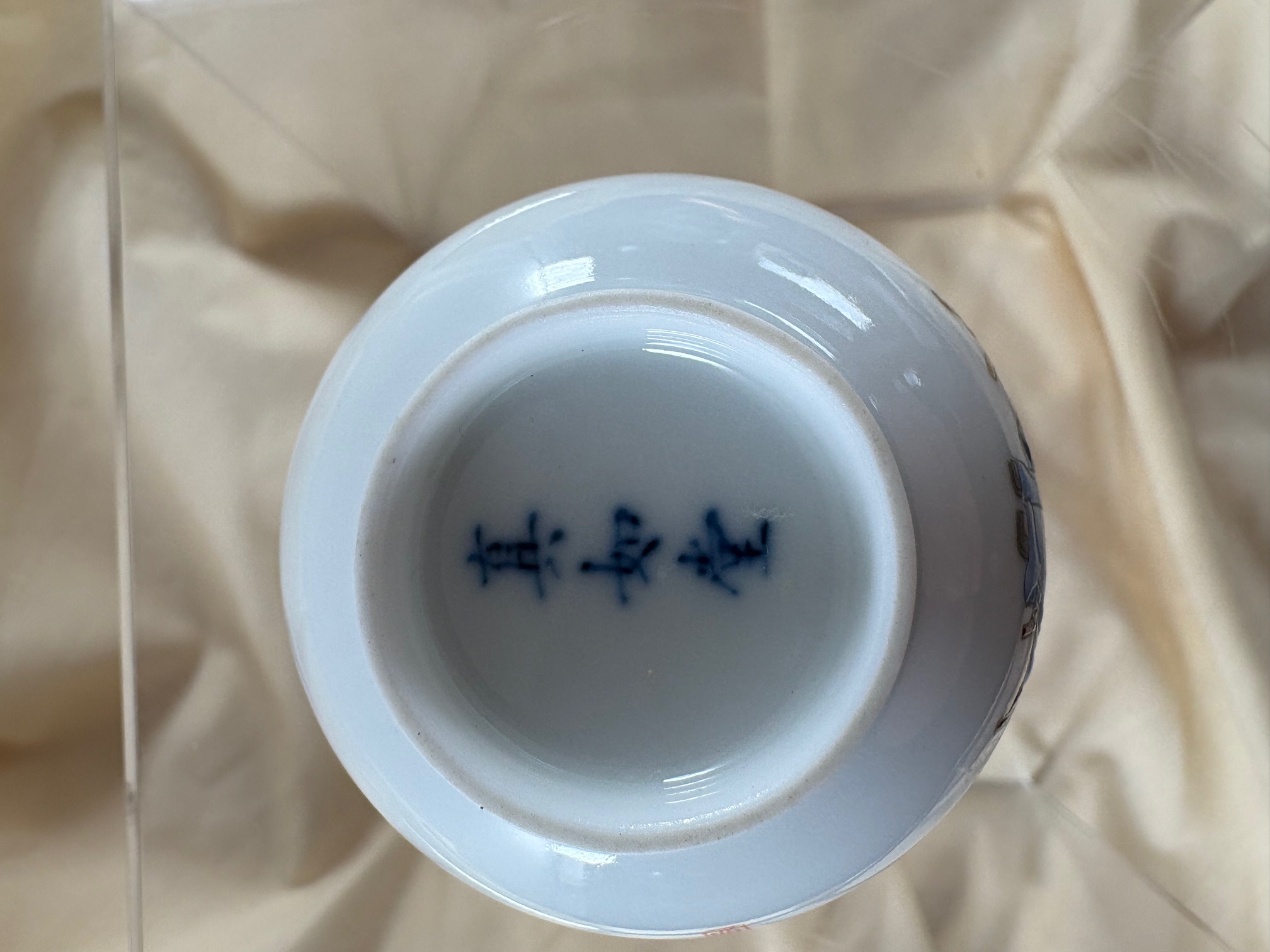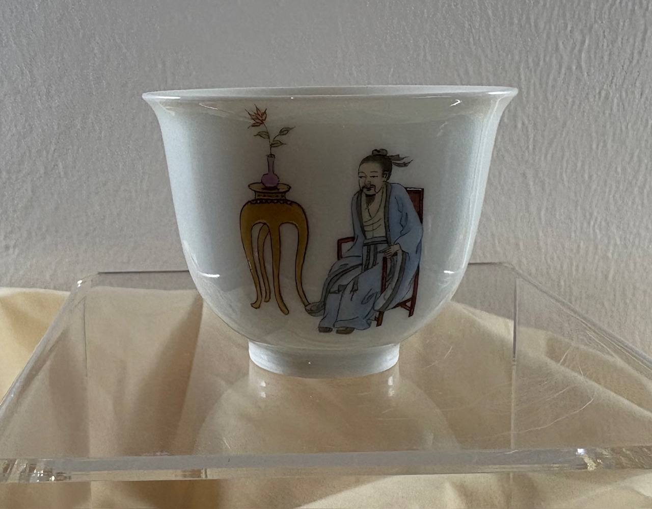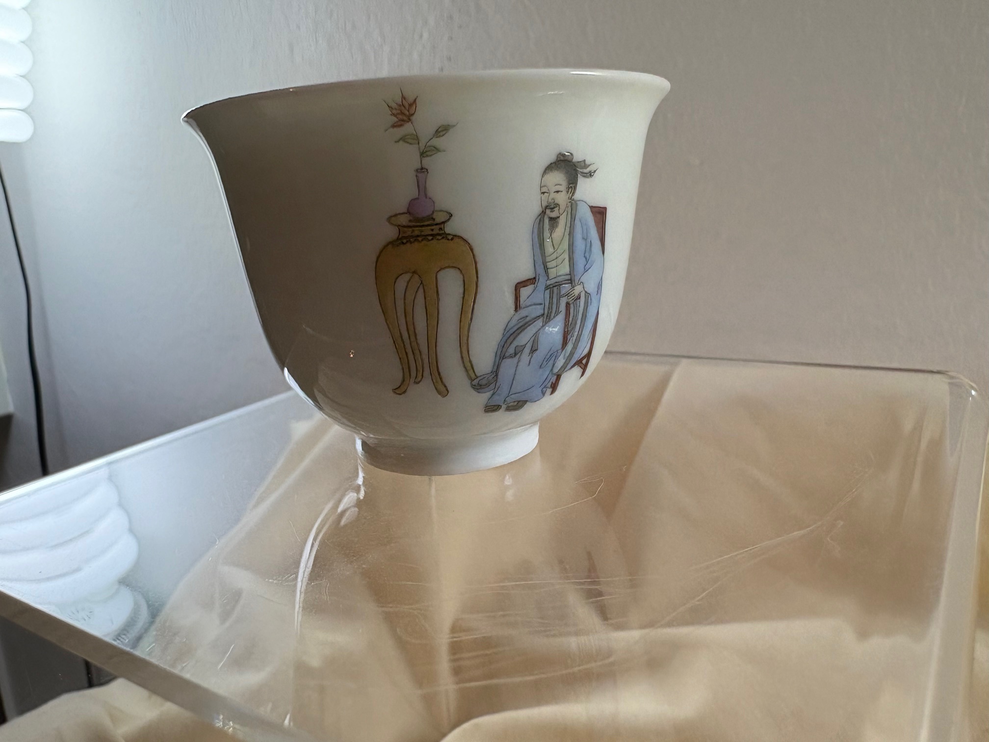 Eine äußerst schöne und seltene Arbeit aus der Manufaktur Zhen Ru Tang in Jingdezhen; die kleine Becher mit einem Volumen von ca. 85 ml sind kunstvoll handbemalt; die Teeschalen zeigen Motive aus der chinesischen Geschichte und Ethymologie, hier Szenen aus dem alten Peking
