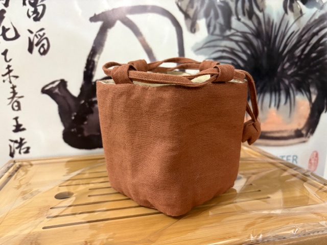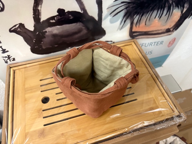 sehr schöner Teekannenbeutel, hell- bis mittelbraun, innen Beige bzw. naturfarben, ca. 11 x 11 x 11 cm