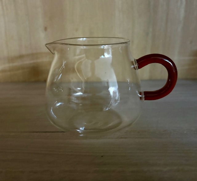 kleine Ausschankkanne mit einem runden Grundriss und braunem Henkel hat ein Volumen von ca. 120 ml
