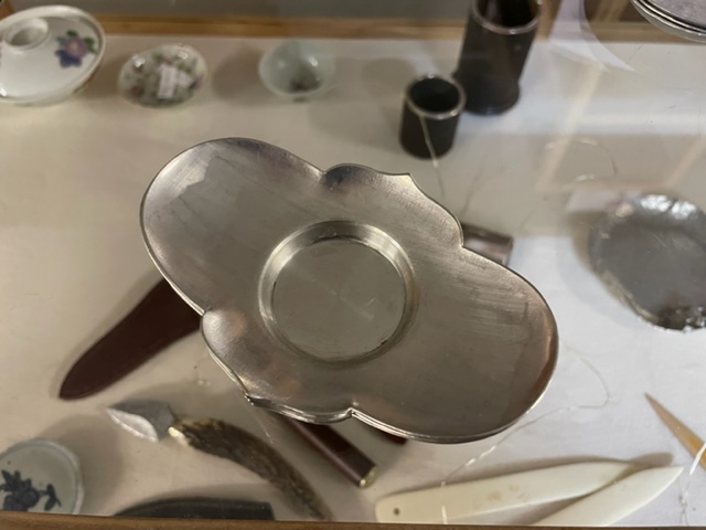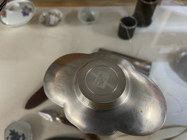 ein Satz mit fünf (5) alten bootartigen Teeschalenuntersetzern aus einer Zinn-Silber-Legierung aus der Zeit der Qing-Dynastie, längliche Schalenform; ca. 115 mm x 80 mm; für Teeschalenfuss mit einem Durchmesser von bis zu ca. 38 mm; an der Unterseite gestempelt