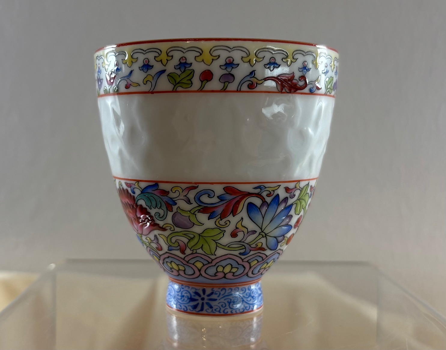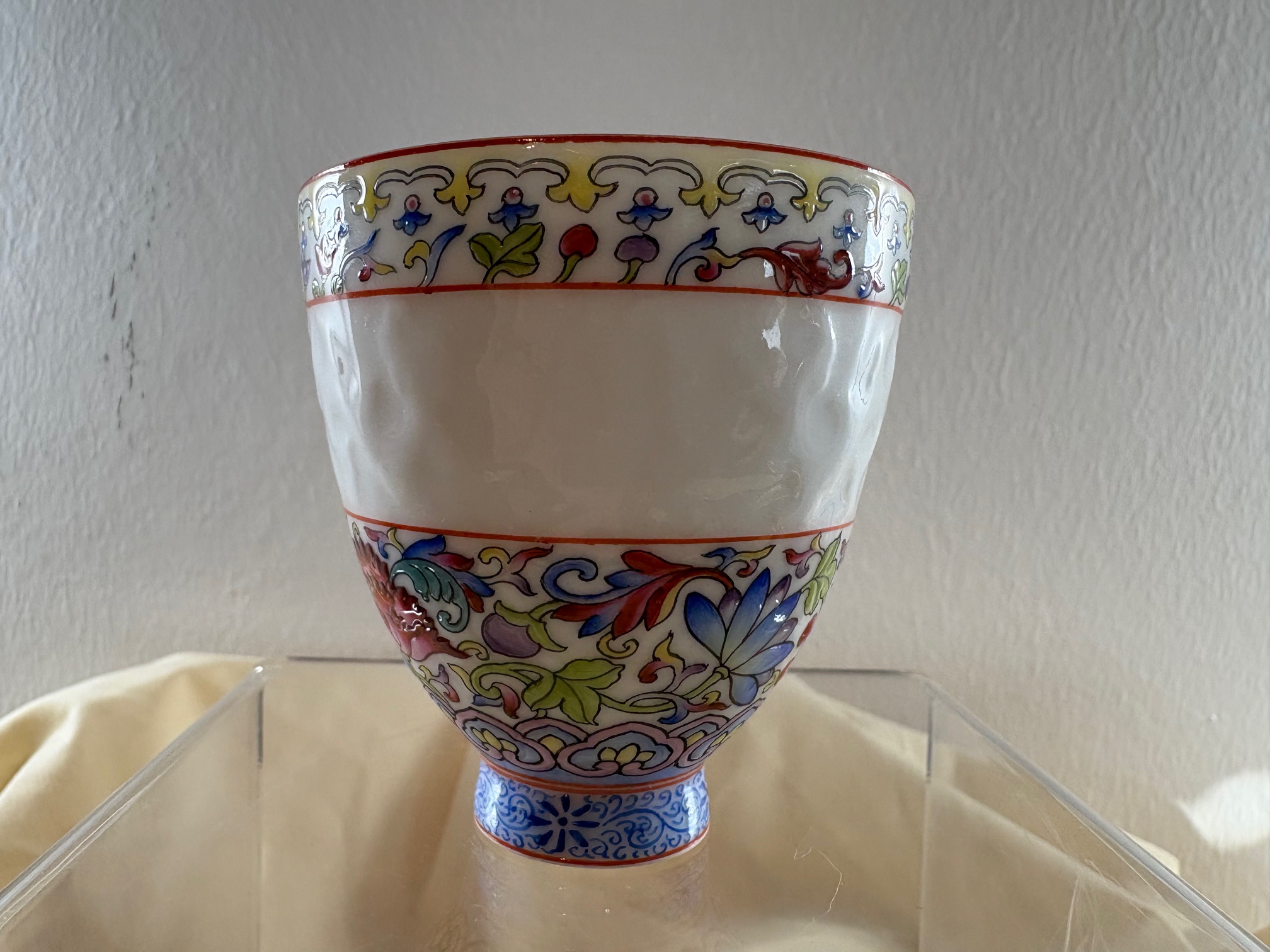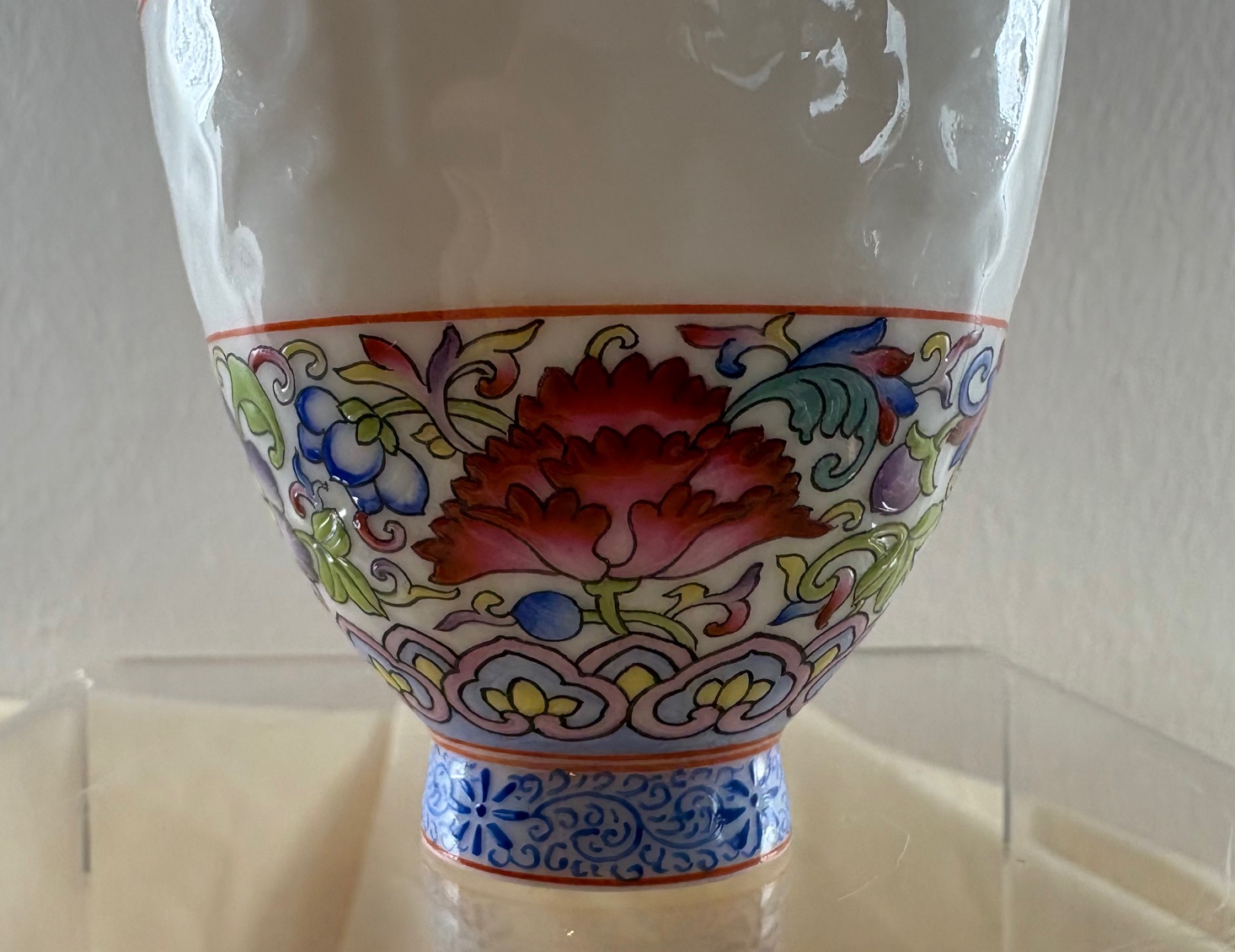 ein ebenso schönes wie seltenes Einzelstück: eine handgearbeitete Teeschale aus Jingdezhen (Provinz Jiangxi); farbenfrohen Teeschalen zieren eine florale Bordüre am Schalenfuß; die Teeschale hat ein Volumen von ca. 100 ml
