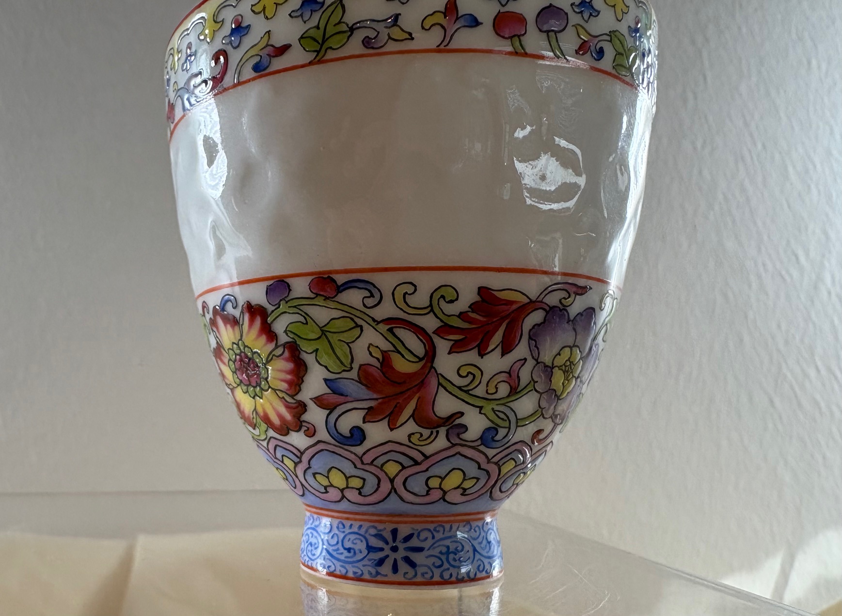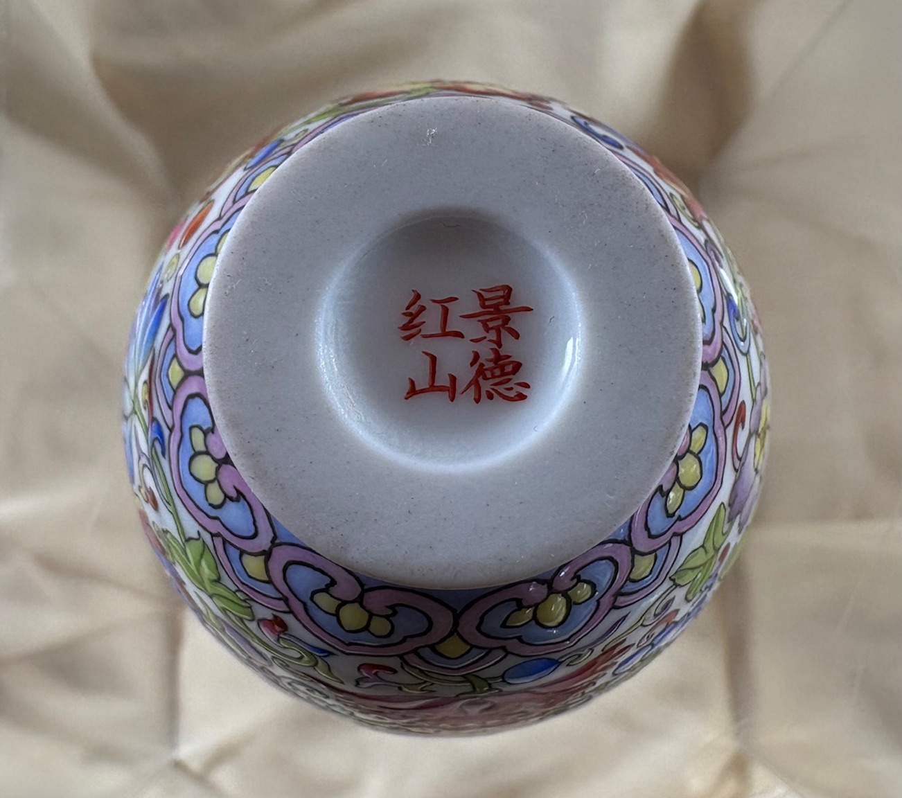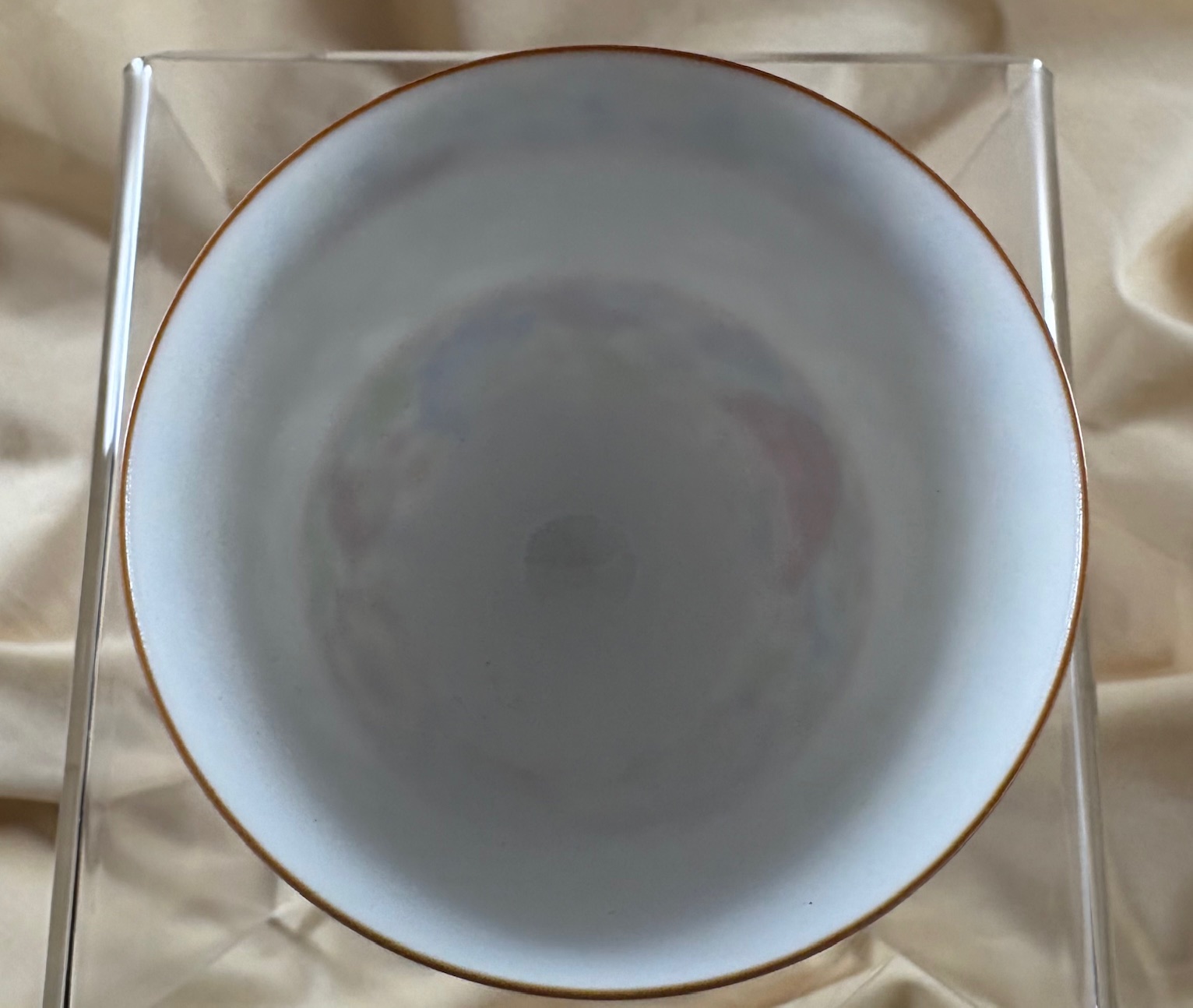 ein ebenso schönes wie seltenes Einzelstück: eine handgearbeitete Teeschale aus Jingdezhen (Provinz Jiangxi); farbenfrohen Teeschalen zieren eine florale Bordüre am Schalenfuß; die Teeschale hat ein Volumen von ca. 100 ml
