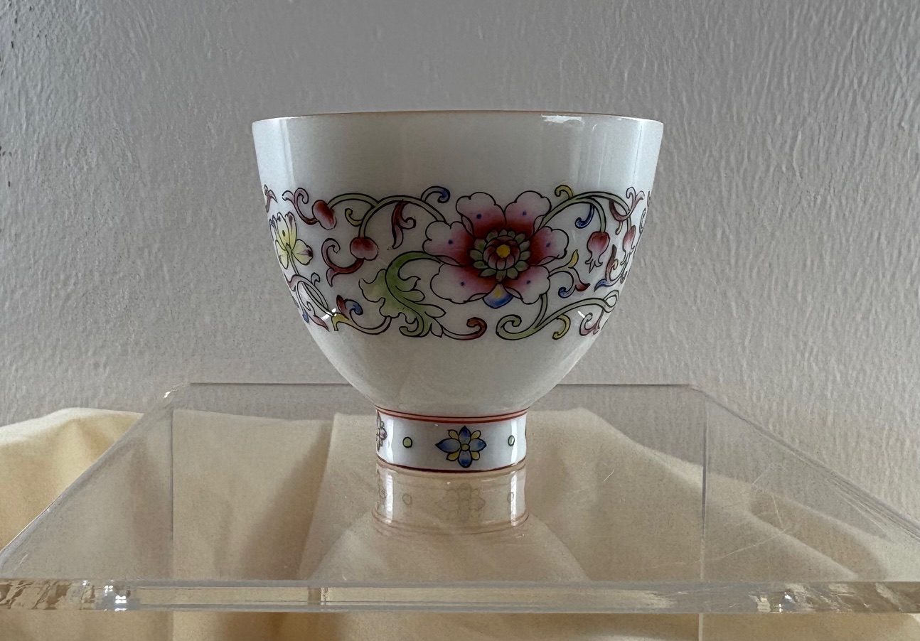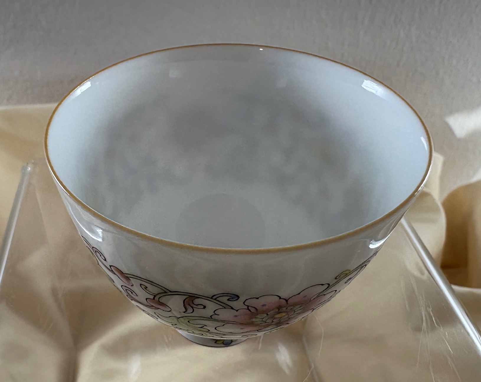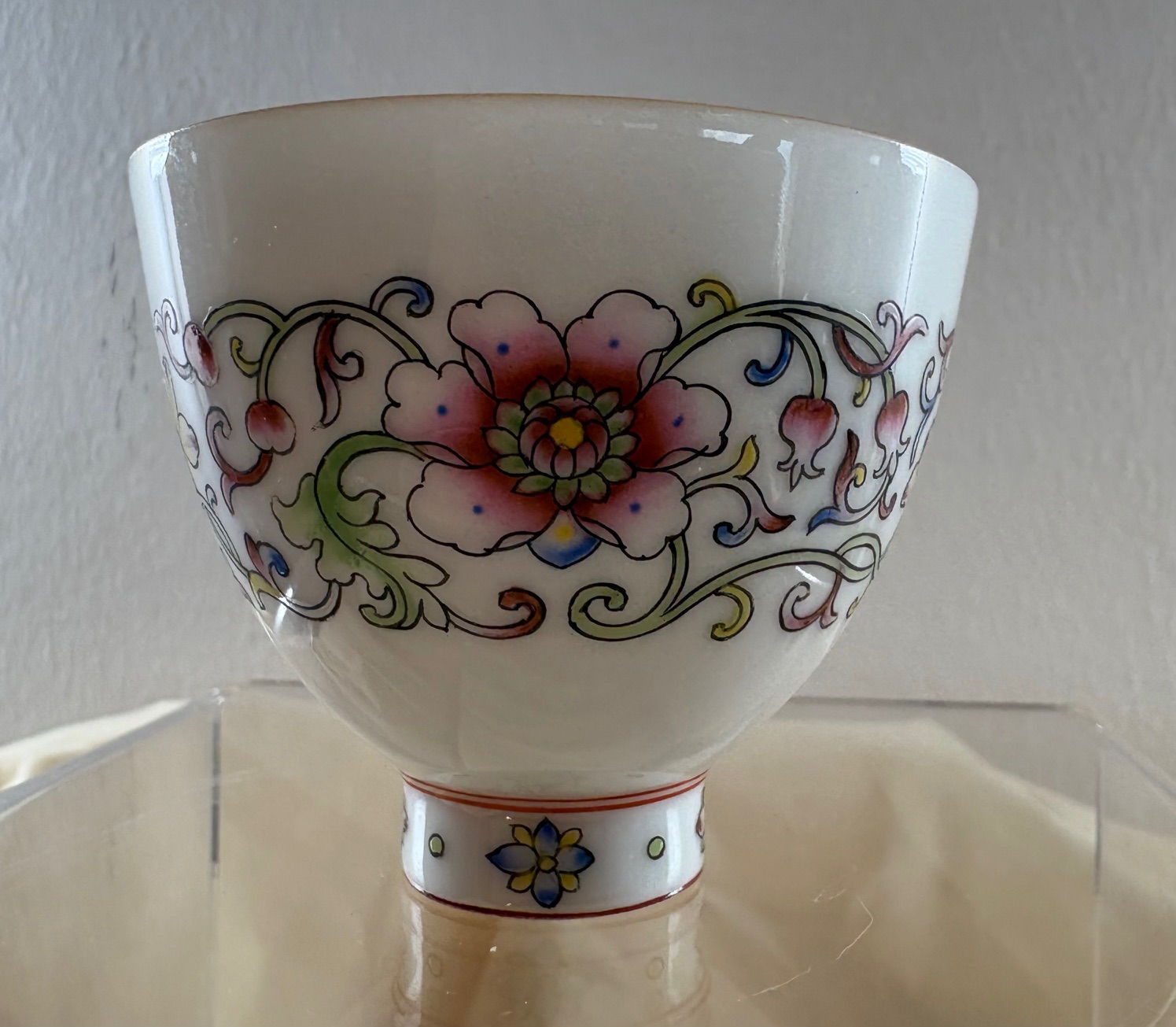 äußerst schönes und seltenes Einzelstück: eine handgearbeitete Teeschale aus Jingdezhen (Provinz Jiangxi); die farbenfrohe Teeschale hat ein Volumen von ca. 80 ml