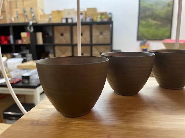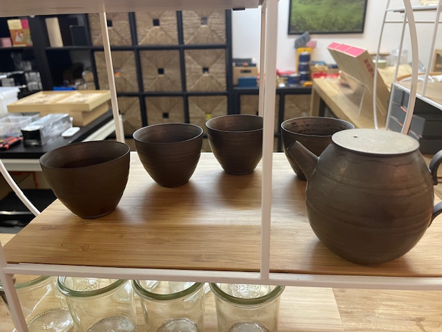 schöne dunkelbronzefarbene Teeschalen aus Jingdezhen; die kleine Becher haben ein Volumen von ca. 80 ml