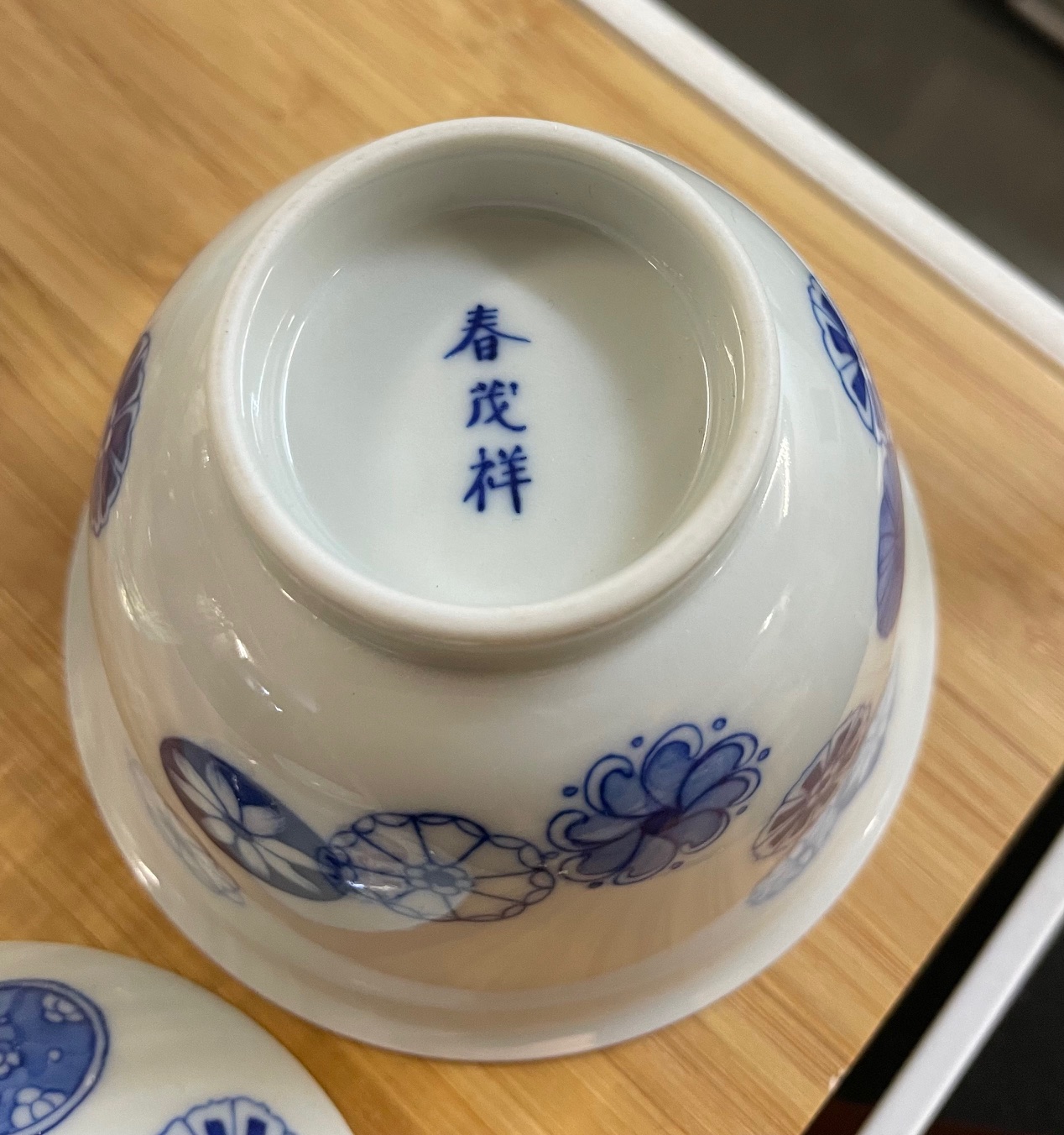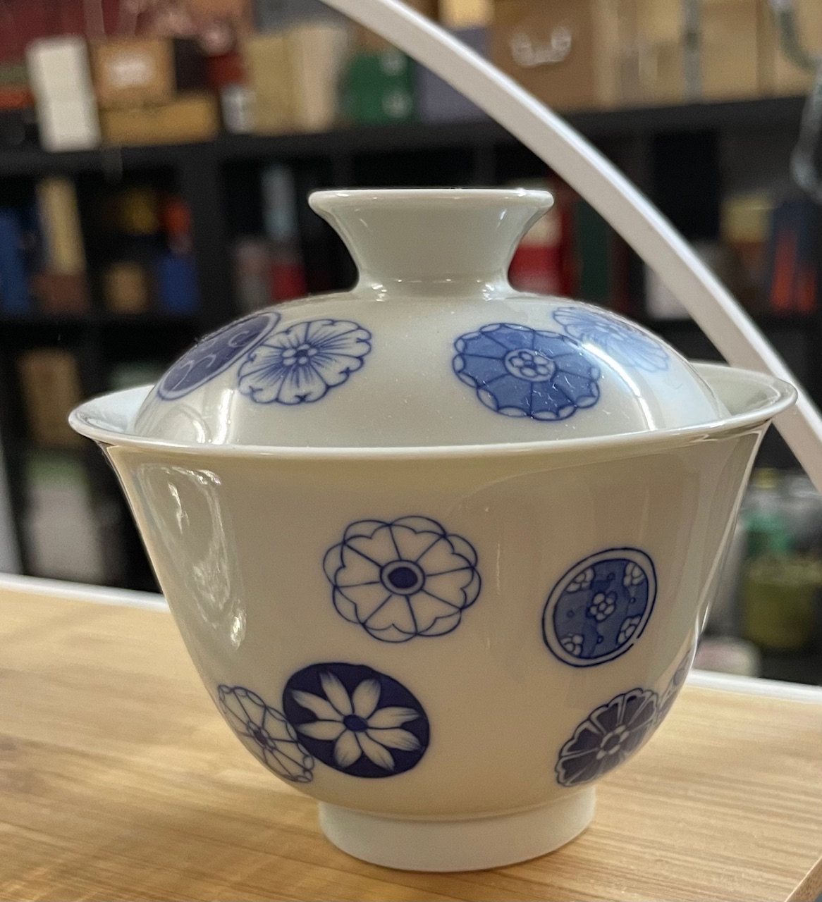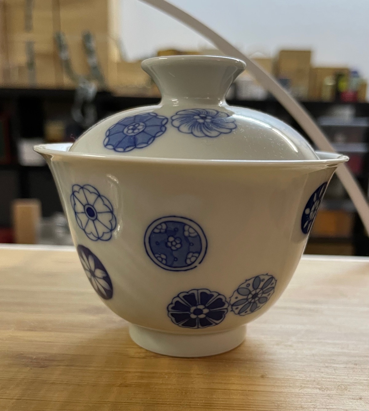 Hier bieten wir einen klassischen, sehr schönen traditionell handgefertigten und handbemalten dreiteiligen Gaiwan (Deckelschale) mit blau-weißem Muster (qing hua) aus Jingdezhen (Provinz Jiangxi)