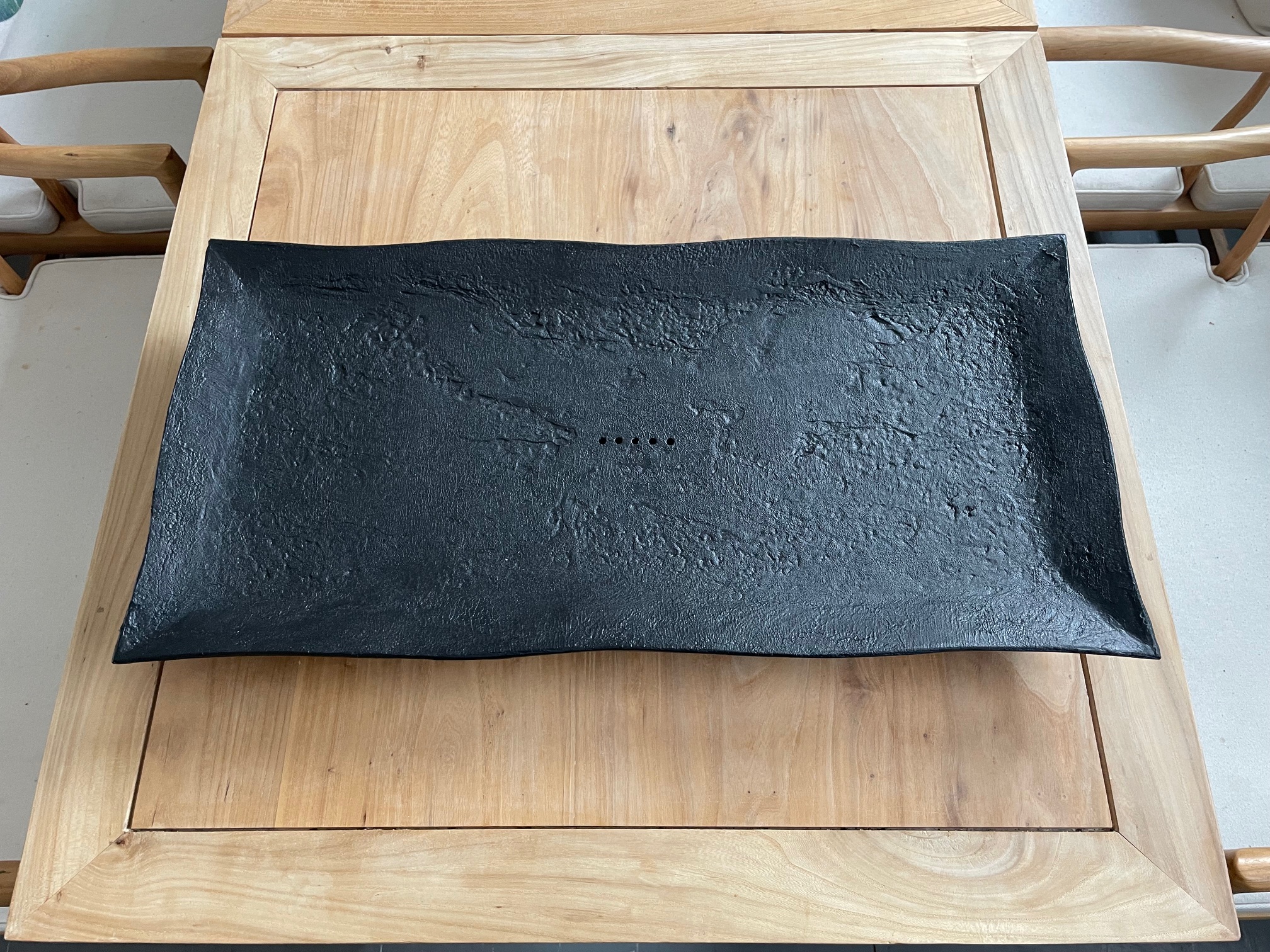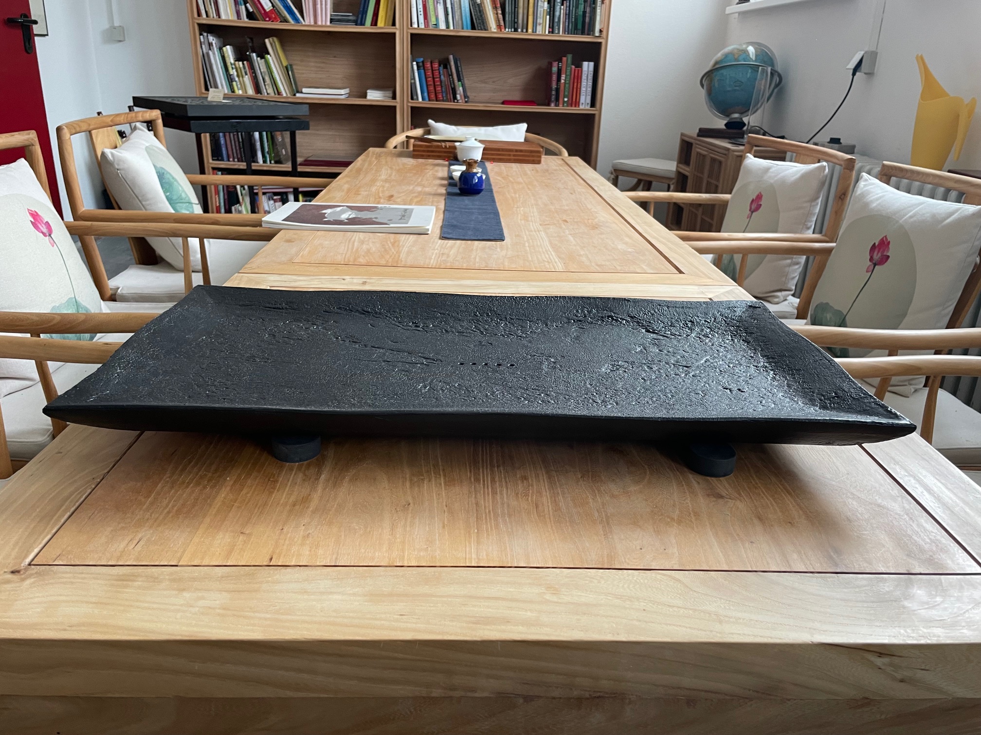 Dieser elegante Granit-Steinteetisch mit seiner rauhen Oberfläche wurde in der Nähe von Xiamen in der Provinz Fujian gefertigt. Der schalenförmige Teetisch hat ein Ablassventil um einen Schlauch für einen Abwasserbehälter anzuschließen.