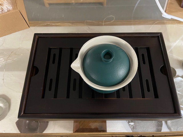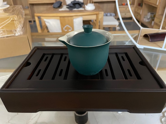 Hier bieten wir ein ebenso schönes wie praktisches Reiseteeset aus Porzellan, bestehend aus einer Teekanne bzw. einem Houhin mit einem Volumen von ca. 190 ml und drei kleinen Teeschalen von jeweils ca. 50 ml, dazu eine passende Tragetasche aus Schaumstoff, um das Teeset sicher mit auf die Reise zu nehmen. Houhin sowie Teeschalen sind außen dunkelgrün lasiert, innen dunkelbeige.