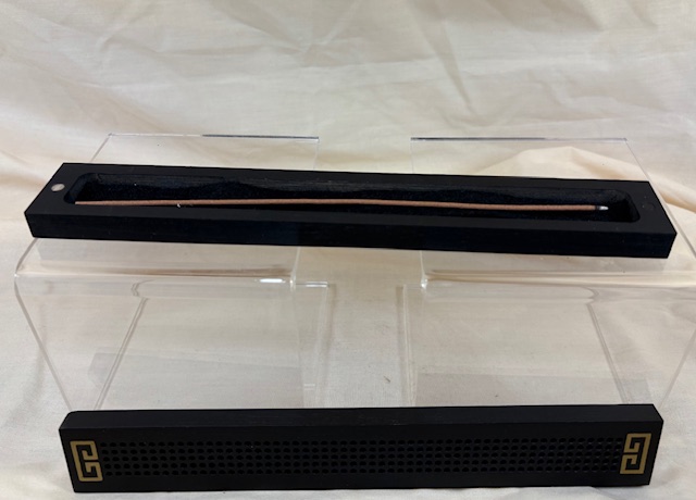 schönes und praktisches Etui (Behälter) aus Ebenholz zum Abbrennen von Räucherstäbchen bis zu einer Länge von 215 mm, innen liegt eine feuerfeste Matte, so dass die Räucherstäbchen problemlos bei geschlossenem Deckel abgebrannt werden können; mit ca. 20 Räucherstäbchen (wahlweise Sandelholz oder Adlerholz); Brenndauer der Räucherstäbchen cxa. 40 Minuten