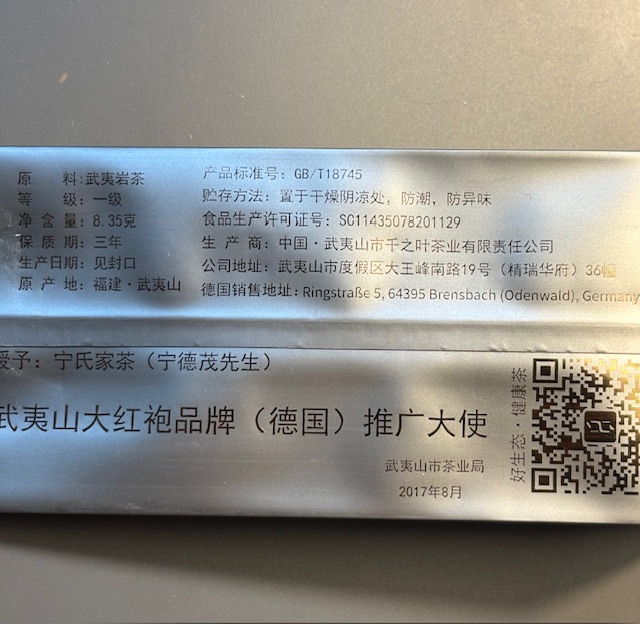 Der Shui Jin Gui ist ein außerhalb Chinas eher seltener angebotener Stein- oder Felsentee aus dem Wuyishan, im Norden der südostchinesischen Küstenprovinz Fujian. Wie der Da Hong Paos hat er ein charakteristisches Aussehen und ein kaum zu verwechselndes, kakaoiges, leicht rauchiges Aroma. Die besseren Qualitäten haben einen sanften, eher fruchtigen Charakter mit einer süßlichen Note. Es gibt zahlreiche Varianten des Steintees, die allesamt nur begrenzt verfügbar sind, und deshalb auch nicht preiswert. Preise der echten Sorten rangieren in Fujian zwischen knapp 1.800 RMB (rund 200 EUR) pro 500 g und weit über 20.000 RMB (mehr als 2.400 EUR). Dieser Shui Jin Gui ist eine Spitzenqualität, aus unseren eigenen Teegärten.