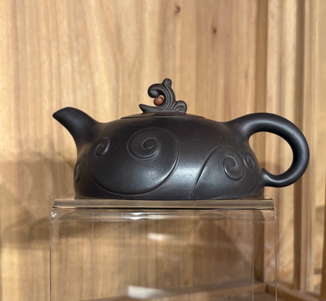 Xi Shi - Zini (Lilaschlamm): klassische Halbmond-Form aus dunkelbraunem Zishaton aus Yixing in der Provinz Jiangsu; Verzierungen am Deckelknauf sowie auf dem Kannenkörper; Volumen ca. 150 ml