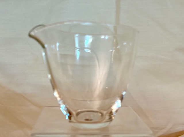 Diese elegante, längliche Glas-/Ausschankkanne mit ovalem Grundriss hat ein Volumen von ca. 180 ml.