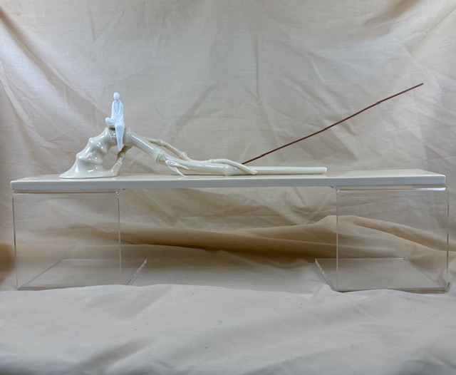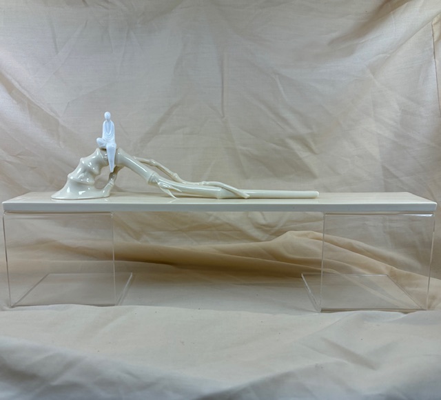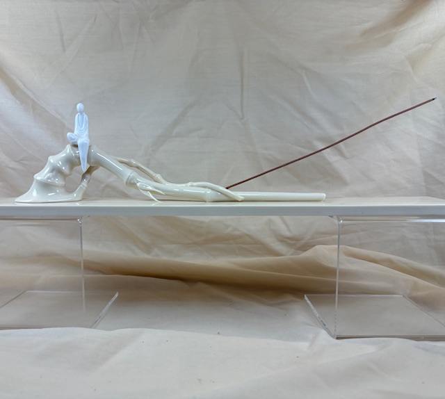Hier sehen Sie einen sehr schönen Räuchestäbchenhalter, der vollständig aus cremeweißem Porzellan handgefertigt wurde. Auf einer Wurzel sitzt andächtig ein Mönch. Der Räucherstäbchenhalter wird schmuckvoll in einer Geschenkschachtel verpackt.