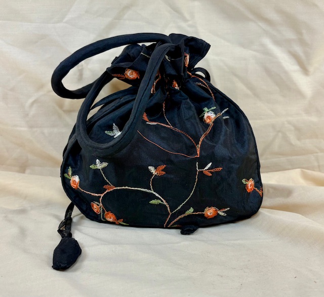 schwarzer Seidenbeutel mit farbigen Blütendarstellungen
