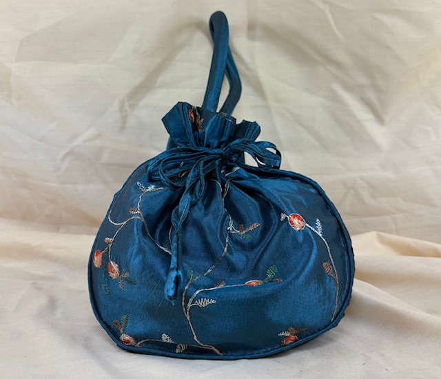 blauer Seidenbeutel mit farbigen Blütendarstellungen