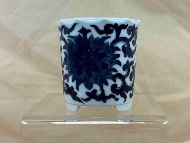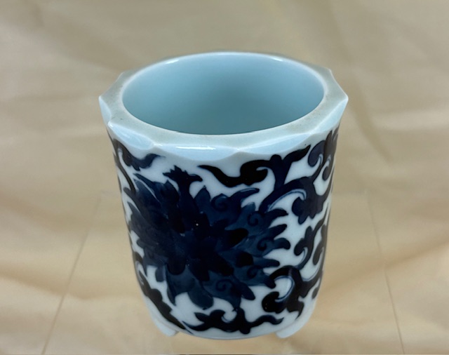 Hier bieten wir ein Räuchegefäß aus Porzellan in Form eines klassichen, dreibeinigen chinesischen Räucherkessels (Tripod) mit blau-weißer Darstellung von Chrysanthemen. Das Räuchergefäß wurde in Jingdezhen in der Provinz Jiangxi gefertigt.