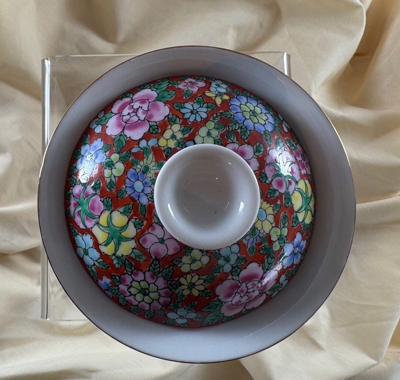 ein sehr seltener, schöner, handgearbeiteter Gaiwan (Deckeltasse) aus Porzellan (fa lang cai); der Gaiwan aus den 1960er Jahren stammt aus Jingdezhen und hat eine prominente, emailleartige (fa lang), bunte (cai) florale Überglasurmalerei nach Art der in der Qing-Dynastie so beliebten famille rose-Technik; der schöne Gaiwan hat ein Volumen von ca. 240 ml (randvoll) und ein nutzbares Volumen von ca. 190 ml