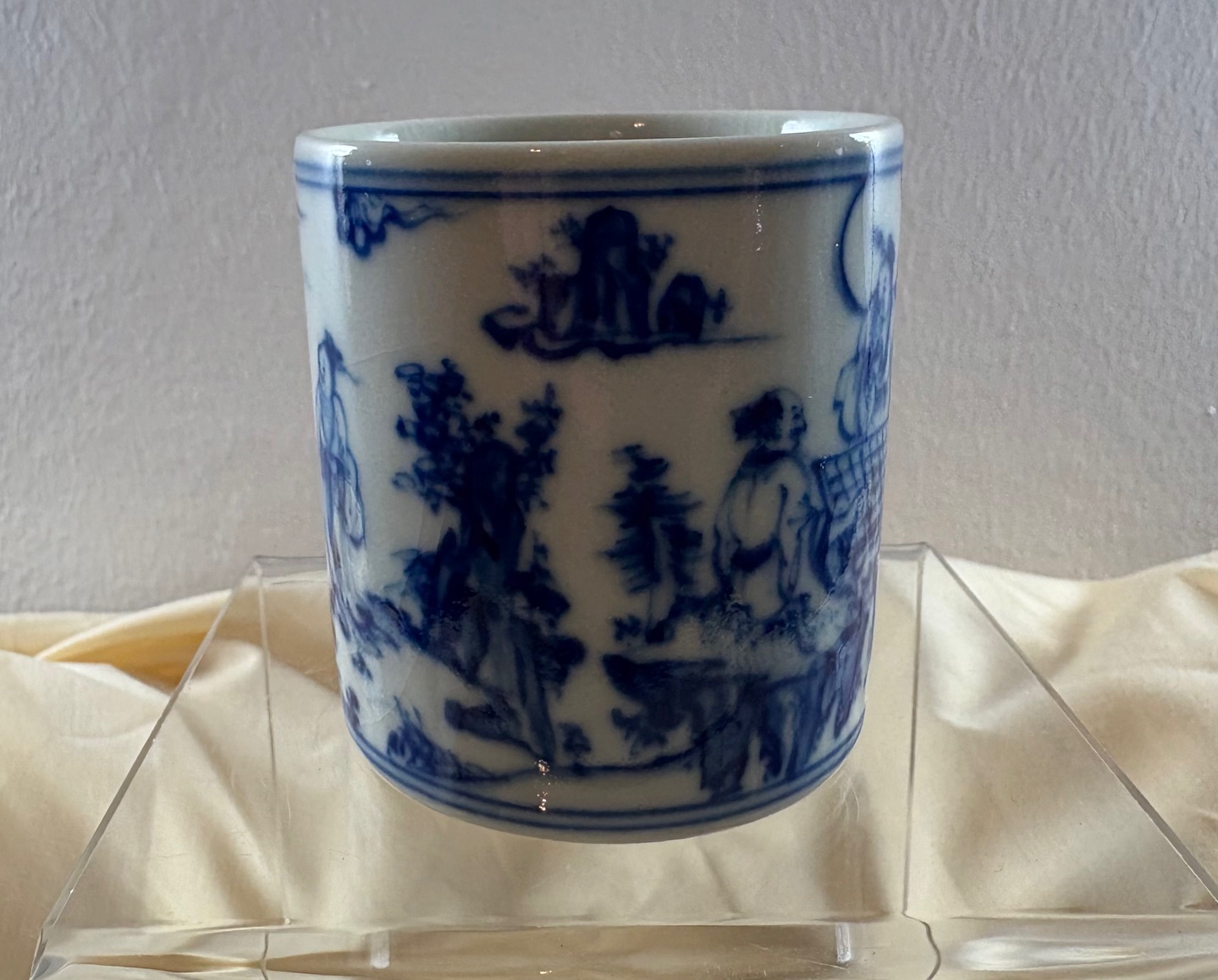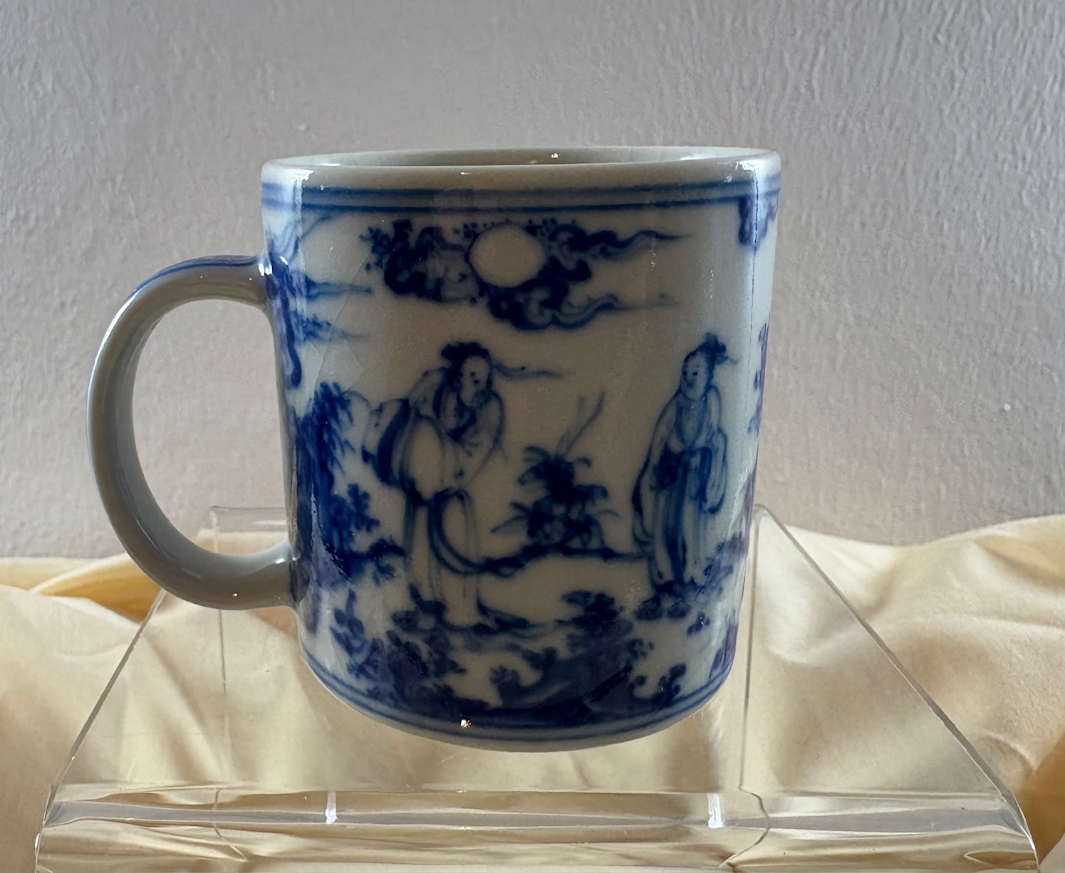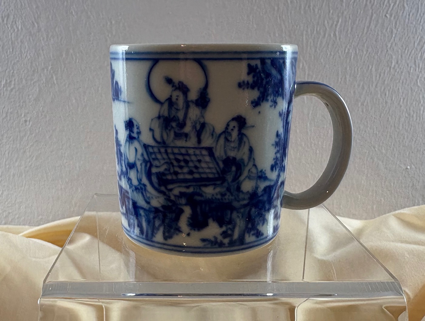 Hier stellen wir Ihnen einen wunderschönen weißen Teebecher mit Henkel mit kobaltblauer Bemalung vor. Der Teebecher wurde in der Manufaktur Qie Zhai Mu Ming in Jingdezhen handgetöpfert und handbemalt. Auf ihm Teebecher sind auf der einen Seite zwi Männer dargestellt, die disputieren, auf der anderen Seite drei Männer, von den zwei Schach spielen. Das Unikat hat ein Volumen von rund 100 ml.