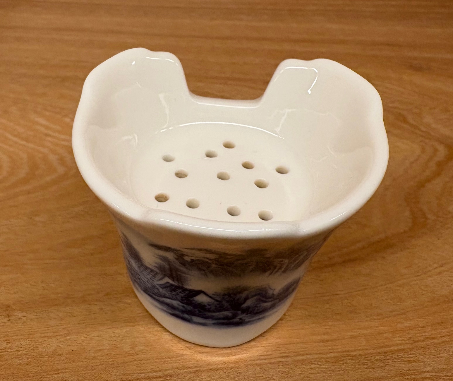 sehr schönes blau-weißes Porzellanteesieb; das vollständig handgearbeitete Teesieb mit seiner Landschaftsdarstellung stammt aus Jingdezhen in der Provinz Jiangxi