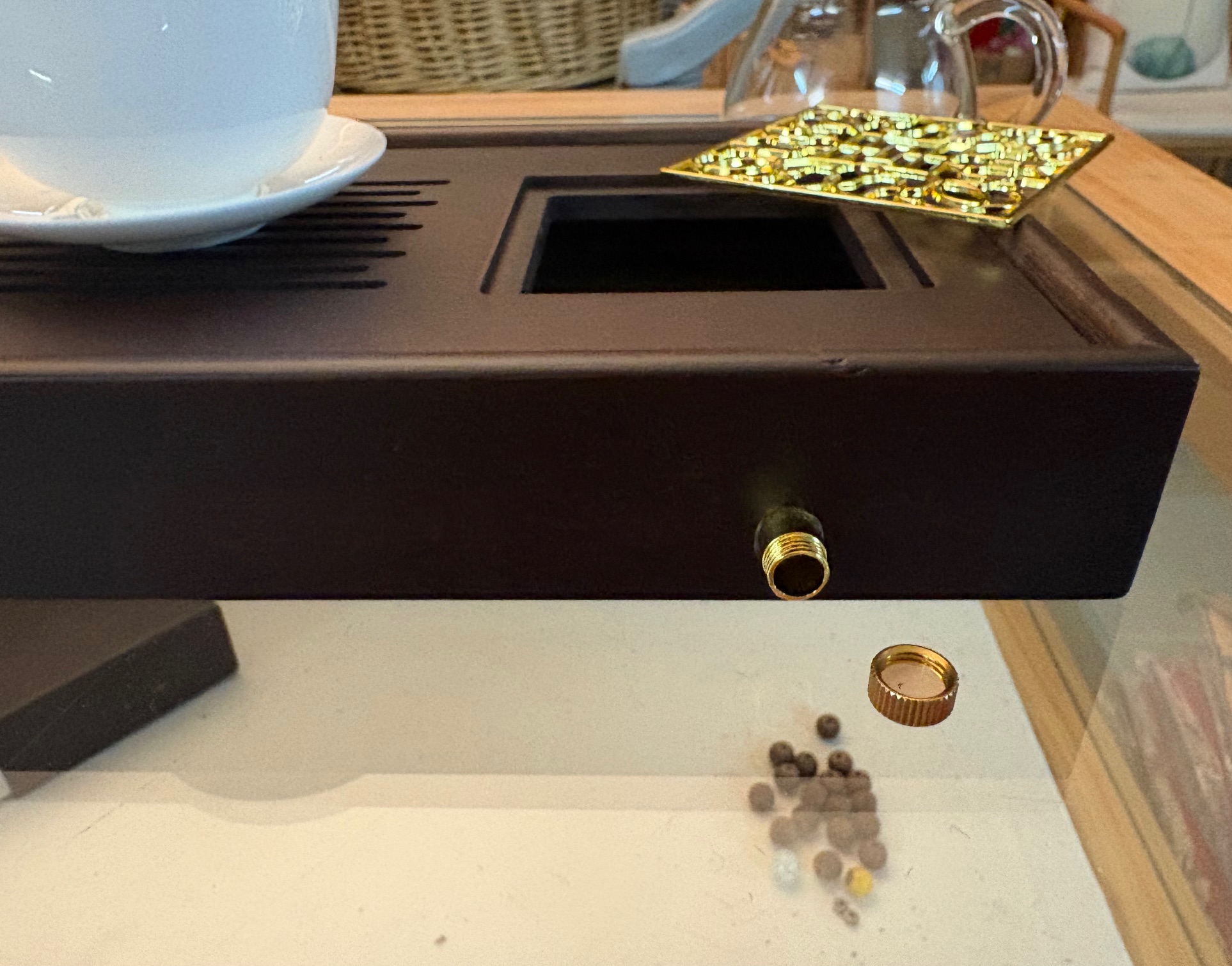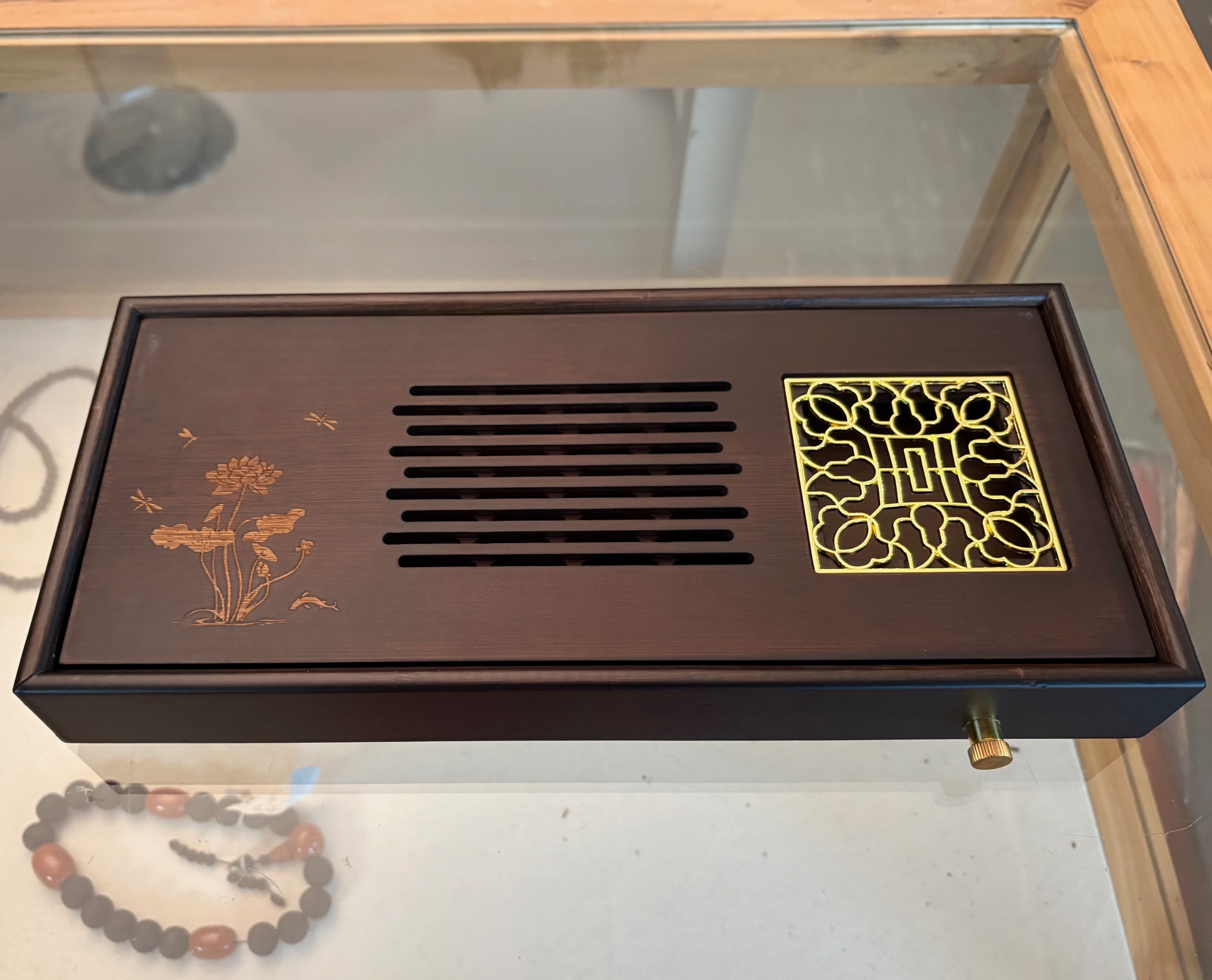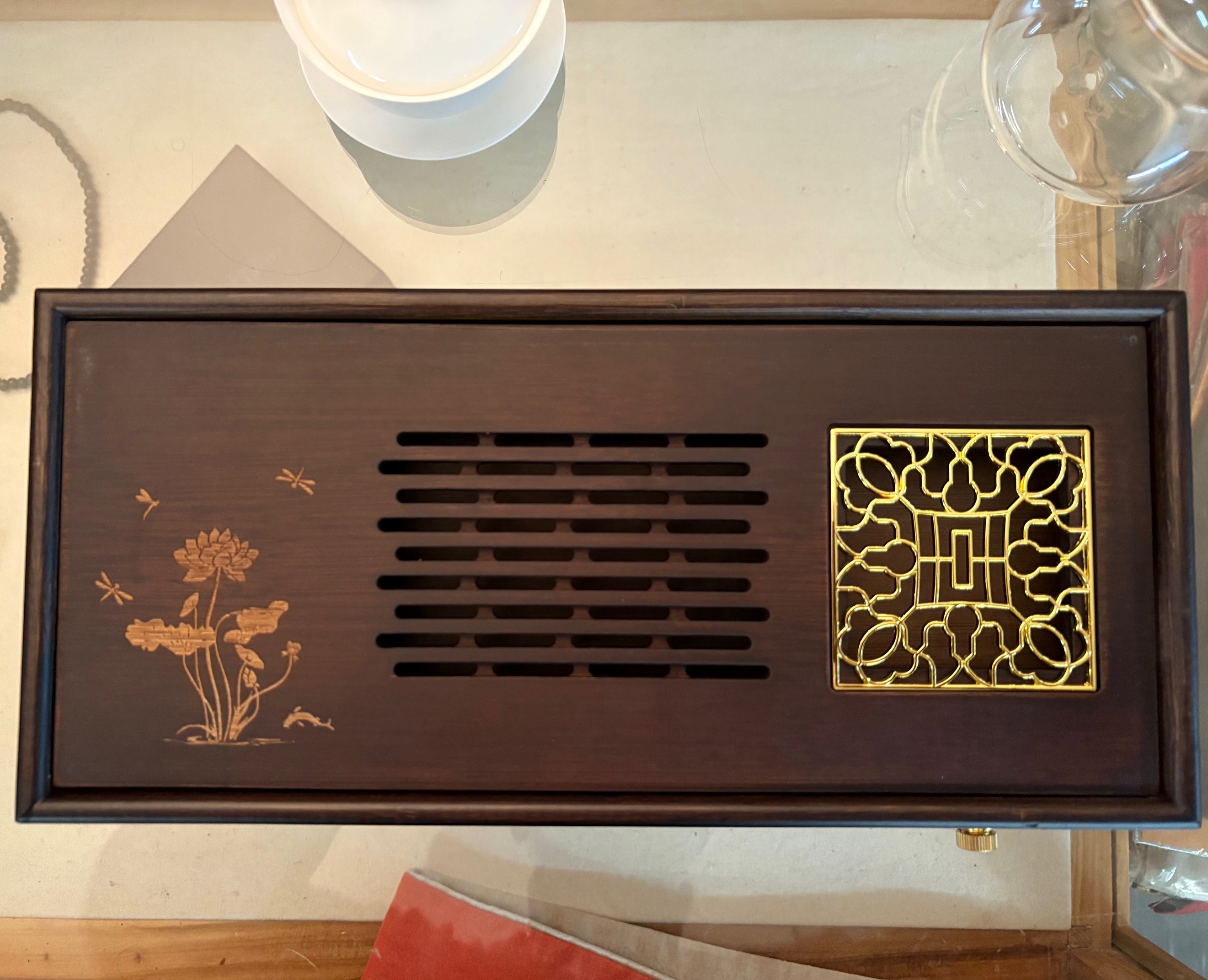 Hier bieten wir einen sehr schönen kleinen, platzsparenden Teetisch bzw. Teeboot aus dunkel gefärbtem Bambus in den Maßen von ca. 320 x 150 x 50 mm. Der schöne Bambustisch, an dem man wahlweise auch einen Ablaufschlauch anschließen könnte, stammt aus Yixing in der Provinz Jiangsu.